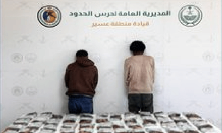 قبضت الدوريات البرية لحرس الحدود في قطاع الربوعة بمنطقة عسير على مخالفين لنظام أمن الحدود من الجنسية الإثيوبية، لتهريبهما (48) كيلوجرامًا من مادة الحشيش المخدر.