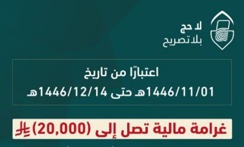 وقال “الأمن العام” عبر حسابه بمنصة “إكس”، إن كل من يُضبّط مؤديًا أو محاولًا أداء الحج دون تصريح، ومن يقوم من حاملي تأشيرات الزيارة بأنواعها كافة، أو يحاول القيام بالدخول إلى مدينة مكة المكرمة والمشاعر المقدسة أو البقاء فيهما يعاقب بغرامة مالية تصل إلى 20 ألف ريال.