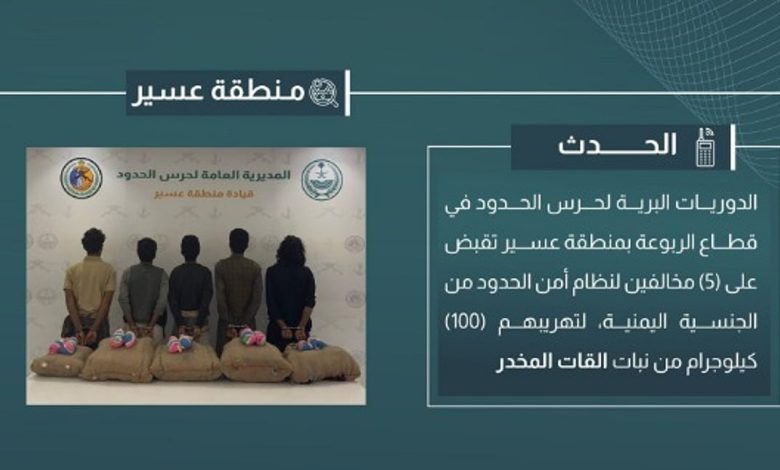 أعلنت الدوريات البرية لحرس الحدود في قطاع الربوعة بمنطقة عسير، القبض على (5) مخالفين لنظام أمن الحدود من الجنسية اليمنية؛ لتهريبهم (100) كيلوجرام من نبات القات