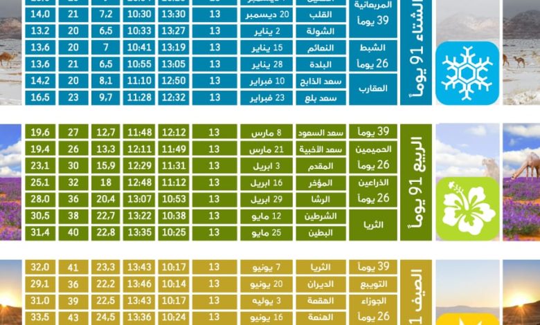 وأضاف أن المربعانية، التي تعتبر البداية الفعلية لفصل الشتاء، تبقى عليها 149 يومًا، تليها الشبط بعد 189 يومًا، ثم العقارب بعد 215 يومًا، والحميمين بعد 254 يومًا.