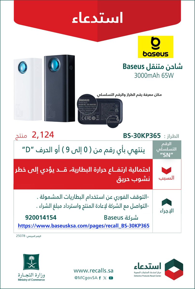 أعلنت وزارة التجارة عن استدعاء 2,124 شاحن متنقل من طراز “بيسوس Baseus – BS-30KP365″، بسبب احتمالية ارتفاع حرارة البطارية بشكل يشكل خطر نشوب حريق.