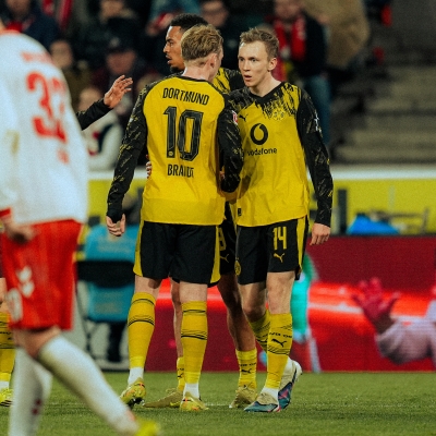 وأحرز ماكسيميليان باير هدف دورتموند الثاني. وتلقى جاماي سيمبسون-بوسي لاعب كولن بطاقة حمراء مباشرة في أواخر الشوط الأول، قبل أن يسجل ياكوب كامينسكي هدفا متأخرا لصاحب الأرض.