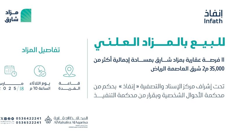 تعلن شركة المحافظ العقارية وبإشراف مركز الإسناد والتصفية «إنفاذ » وبقرار من محكمة التنفيذ، عن إقامة مزاد “شارق” في قاعة الفريدة يوم الثلاثاء 18 رمضان 1446 هـ الموافق 18 مارس 2025م الساعة 10 مساءً.
